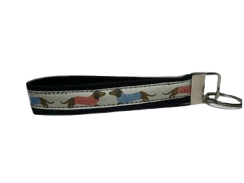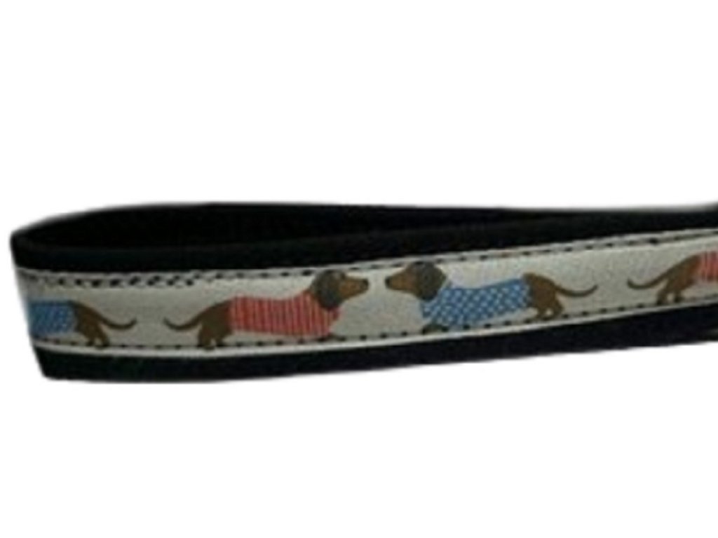 - Základ tvoří pevný popruh, na kterém je našita stuha s motivem jezevčíků.