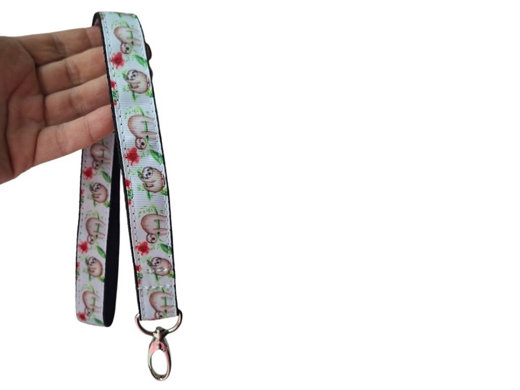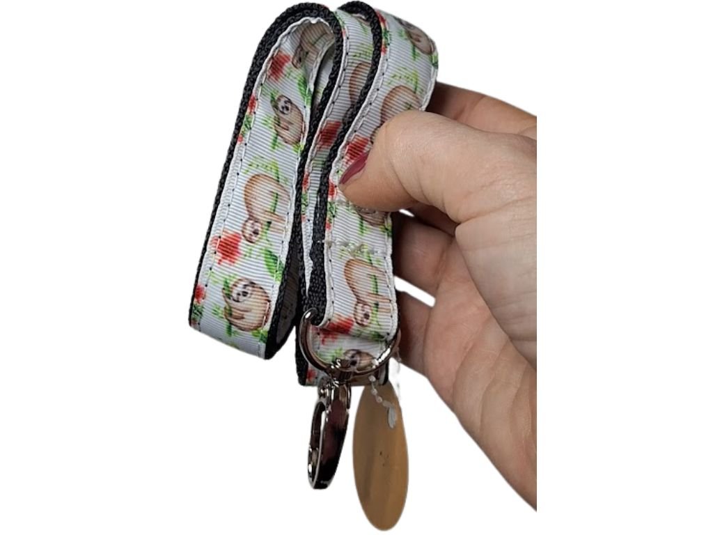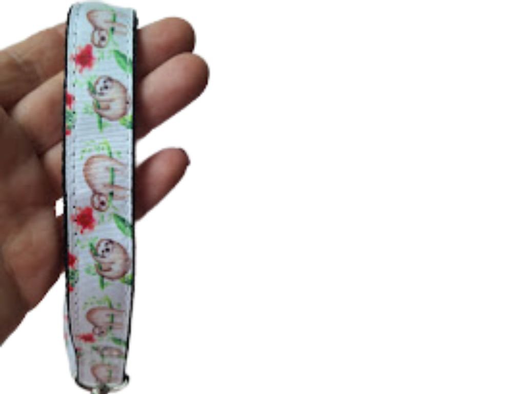 - Podklad tvoří černý popruh, na kterém je našita stuha s motivem Lenochoda. .