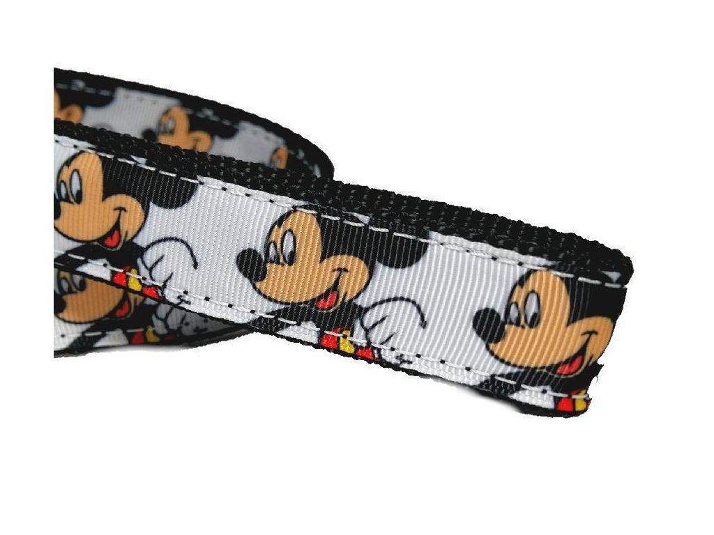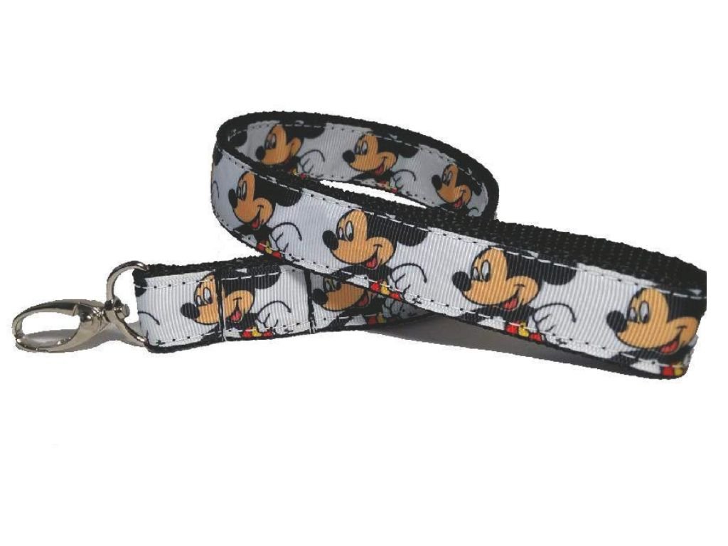 Stylová klíčenka na krk Dinofashion s motivem Mickey Mouse je vyrobena z pevného černého popruhu o šířce 2,5 cm a zakončena kovovou karabinou.