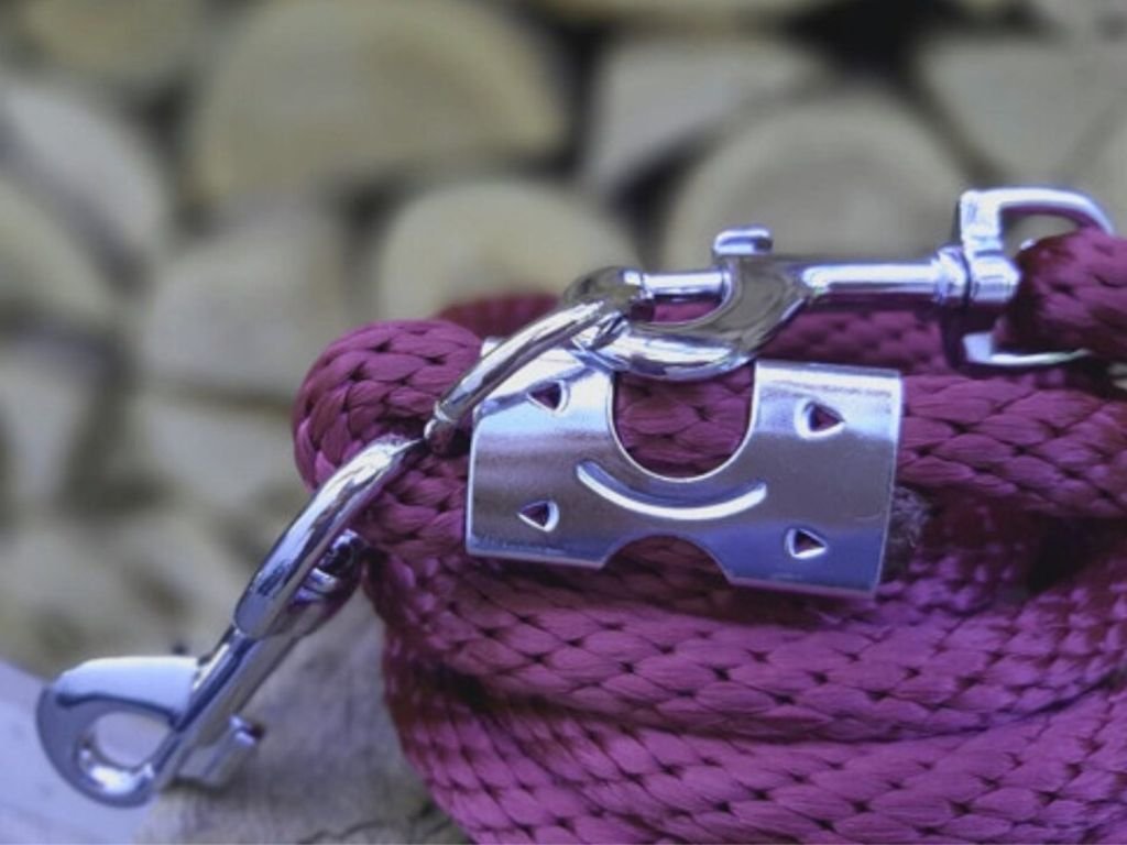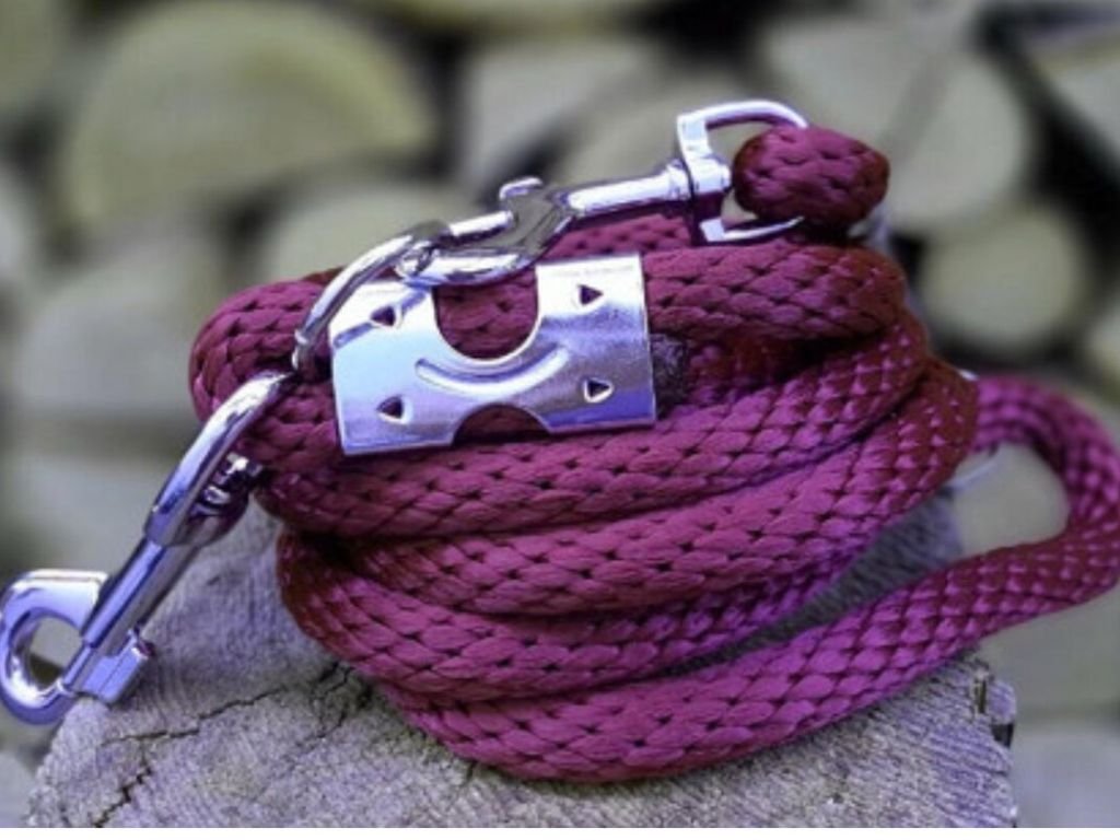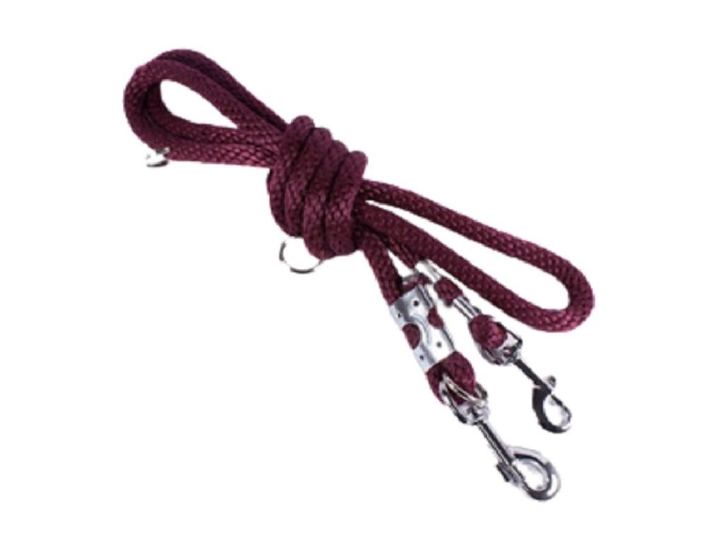 - Velice pevné přepínací vodítko v ostružinové barvě zakončené plechovými svorkami a dvěma pevnými karabinami.